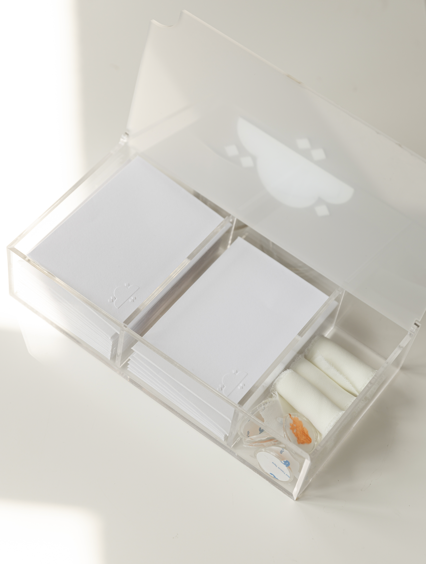 Indulge in the beauty of this customizable acrylic box that is perfect for storing envelopes and stamp pieces. Add your own personal touch with your name on it, and elevate your mailing experience with the included cards, stickers, and wax stamp.